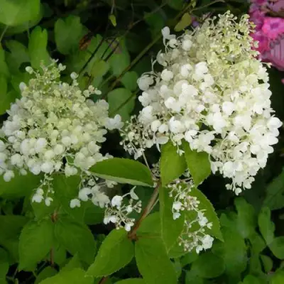Побеги прямостоячие: молодые имеют красноватый оттенок, а к моменту одревеснения становятся буро-коричневыми. Листья яйцевидные, тускло-зеленые сверху и серо-зеленые снизу, с легкой бархатистой поверхностью. Гортензия метельчатая Дартс литтл дотт описание цветения: оно обильное, начинается с середины июня и продолжается до октября. Соцветия, хотя и небольшие (6–10 см в диаметре, до 15 см в длину), имеют красивую пирамидальную или почти шаровидную форму. Цветки сначала чисто белые, но во время вегетации меняют окраску, становясь розовыми, при этом отцветшие соцветия долго держатся на кусте, сохраняя декоративность.
