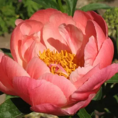 Цветы пиона Корал Суприм являются настоящим произведением искусства: их чашевидная форма и крупный размер с диаметром до 16 см заставляют остановиться и полюбоваться. Окраска цветков лососево-кораллово-розовая, тычинки ярко-желтые. Этот сорт известен своим обильным цветением и может долго радовать глаз — при правильном уходе цветы могут сохранять свежесть до недели после срезания. Аромат достаточно слабый.