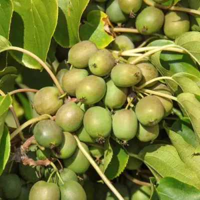 Плоды актинидии Джиральди крупные, бочковидной формы и могут достигать массы в 10-11 граммов. Цвет их кожуры варьируется от буро-зеленого до темно-зеленого. Хотя кожура кажется грубоватой на ощупь, внутри она скрывает сочную, мягкую при созревании мякоть. Вкус плодов сладкий, без малейшего признака кислоты, с ярким ананасно-яблочным ароматом, который восхитит даже самых требовательных гурманов. Созревание плодов приходится на сентябрь.