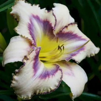 Цветы данного сорта отличаются крупноцветковыми характеристиками, достигая в диаметре до 15 см. Окраска цветка великолепна: нежно-кремовая с ярким сиреневым глазом и каймой, что делает его настоящим украшением любого сада. Основная окраска в кремовых и сиреневых тонах придает ему утонченный вид, а гофрированные лепестки и сиреневая кайма добавляют изысканности. Средняя интенсивность аромата делает цветение еще более привлекательным и запоминающимся.