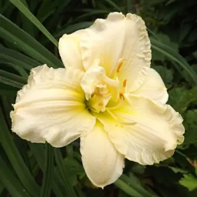 Цветы лилейника Икебана Стар отличаются махровой формой и крупными размерами. В диаметре они достигают 13-15 см и окрашены в нежный кремово-желтый цвет с белой каймой, придающей им еще большую выразительность. Основная окраска мягкая и бледная, что делает цветы привлекательными для глаза. Кроме того, лепестки имеют бахромчатую текстуру, а горло цветка — зеленоватый оттенок.