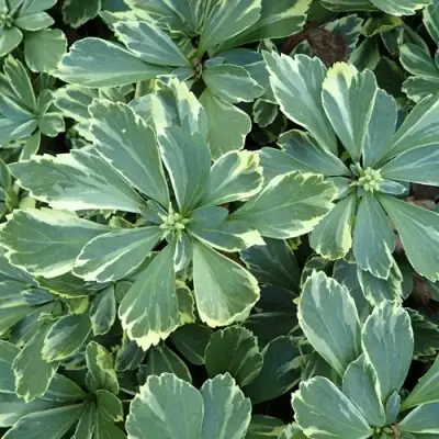 Одним из главных преимуществ Пахизандры Вариегата являются ее необычные листья. Темно-зеленая крона с изысканным бело-кремовым окаймлением притягивает внимание и добавляет изысканности любому ландшафтному дизайну. Листья обладают обратно яйцевидной или овальной формой и особенно ярко проявляют свои краски весной и осенью, оставаясь декоративными на протяжении всего сезона.