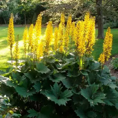 Бузульник Пржевальского привлекает внимание своими прямыми стеблями и крупными глянцевыми листьями, которые имеют сильно разрезанную, остропальчатую форму. Глянцевая и кожистая структура листьев подчеркивает их богатый зелёный цвет, создавая яркий и эффектный контраст с ярко-желтыми соцветиями. Прочные цветоносы поддерживают плотные колосовидные соцветия, длина которых может достигать 50-70 см. Несмотря на их компактные размеры, многочисленные мелкие цветы создают впечатление обильного цветения, которое наблюдается в июне и июле.