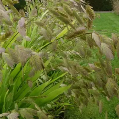 Листья Хасматиума широколистного имеют длину 9-20 см и ширину 1-2 см, на протяжении сезона сменяя цвет с насыщенного салатово-зелёного летом на теплый бронзовый и коричневый в осенний период. Густая облиственность придаёт растению живописный вид.