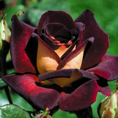 Цветок этой розы имеет кремово-бордовую окраску бутона. Окраска цветка представлена бордово-красным цветом с золотисто-кремовой обратной стороной лепестков. Цветок очень насыщенного и темного цвета.