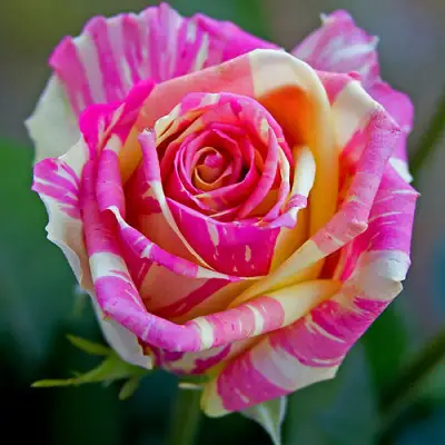 Роза "Фиеста" привлекает внимание своим необычным и очаровательным окрасом. Основная окраска цветка является сочетанием ярко-желтых и розовых оттенков с лимонными и кремовыми полосками, создавая градиентный эффект, который переходит от молочно-желтого к нежно-розовому. Этот двухцветный, пестрый окрас добавляет яркости и свежести в любой букет или цветник.