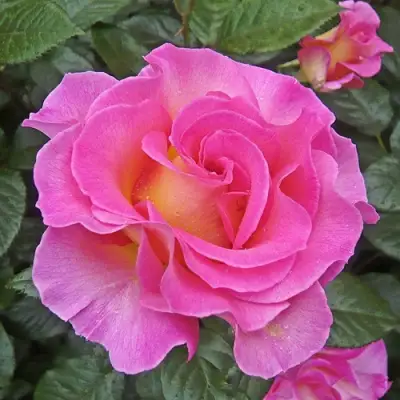 Цветки крупные, до 11 см в диаметре, густомахровые (более 30 лепестков), с насыщенным розовым тоном по краям и теплым, почти абрикосовым центром. При распускании цвет меняется, что делает каждый бутон уникальным. Аромат сильный, сложный, с нотами чая и свежести, заметен даже на расстоянии.