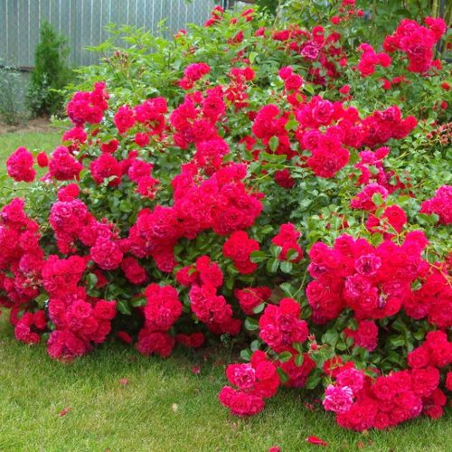 Цветение обильное, продолжительное: с начала июня и до поздней осени. Цветки мелкие (до 5 см), густомахровые, собраны в плотные соцветия. Окрас — насыщенно-красный, с глубоким малиновым подтоном. Даже при сильном солнце лепестки не выгорают. Цветы формируются в кистях по 5–15 штук, и благодаря самоочищающемуся типу лепестков куст всегда выглядит ухоженным. Аромат слабый, почти незаметный.