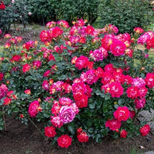 Главная особенность сорта — насыщенное цветение с июня до осени. Цветки чашевидные, диаметром 6–8 см, махровые. Окраска — глубокий пурпурно-малиновый, с кремовой изнанкой лепестков. При раскрытии бутон сохраняет форму, не осыпается. Цветы собраны в кисти по 3–7 штук, что создаёт плотный цветовой объём на кусте.