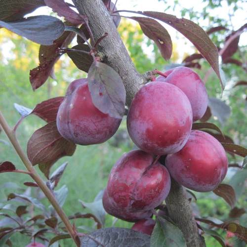 Листья растений ярко-красные, а цветы — розоватые и ароматные, что придаёт вашему саду особое очарование. Плоды сливы имеют крупный размер, весом около 30 граммов и округло-овальную форму. Их темно-пурпурный цвет почти достигает черного отлива, а под кожицей можно обнаружить множество серых точек, что делает их ещё более притягательными.