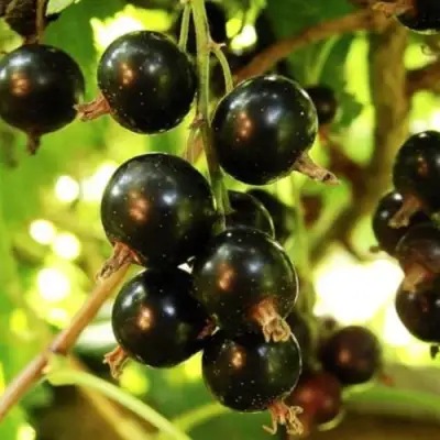 Ягоды крупные смородины Нары (1,9-3,3 г), округлые, одномерные, черные, блестящие, на длинных плодоножках, с сухим отрывом, вкус кисло-сладкий (4,6 балла).